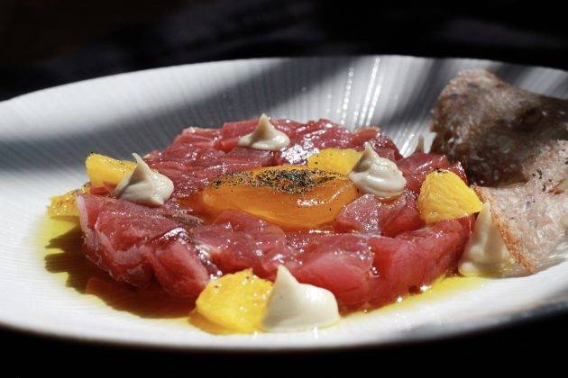 O prato faz parte do menu de entradas e vem com atum fresco picado, gema curada, emulsão de castanha, laranja bahia tostada e tulie de pão. Dá para comer de terça à sábado, no almoço e no jantar, e domingo, no almoço.