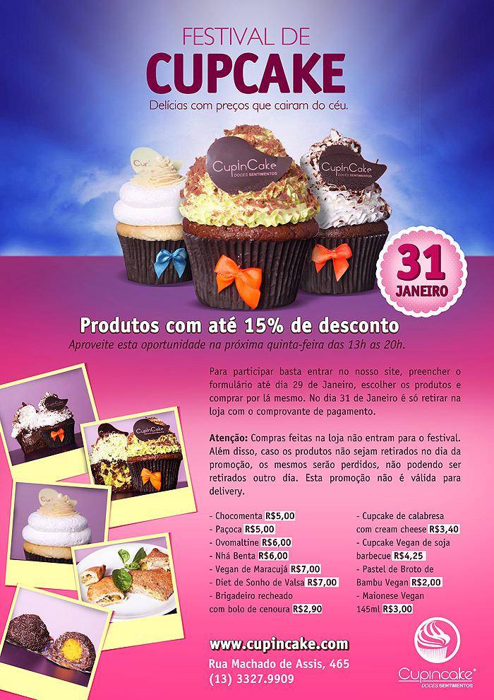 No próximo dia 31 de janeiro de 2013 a Cup in Cake fará o segundo festival de cupcakes! Além de cupcakes, nesta edição terão também outros produtos, entre eles vegans e diets. Confira!
