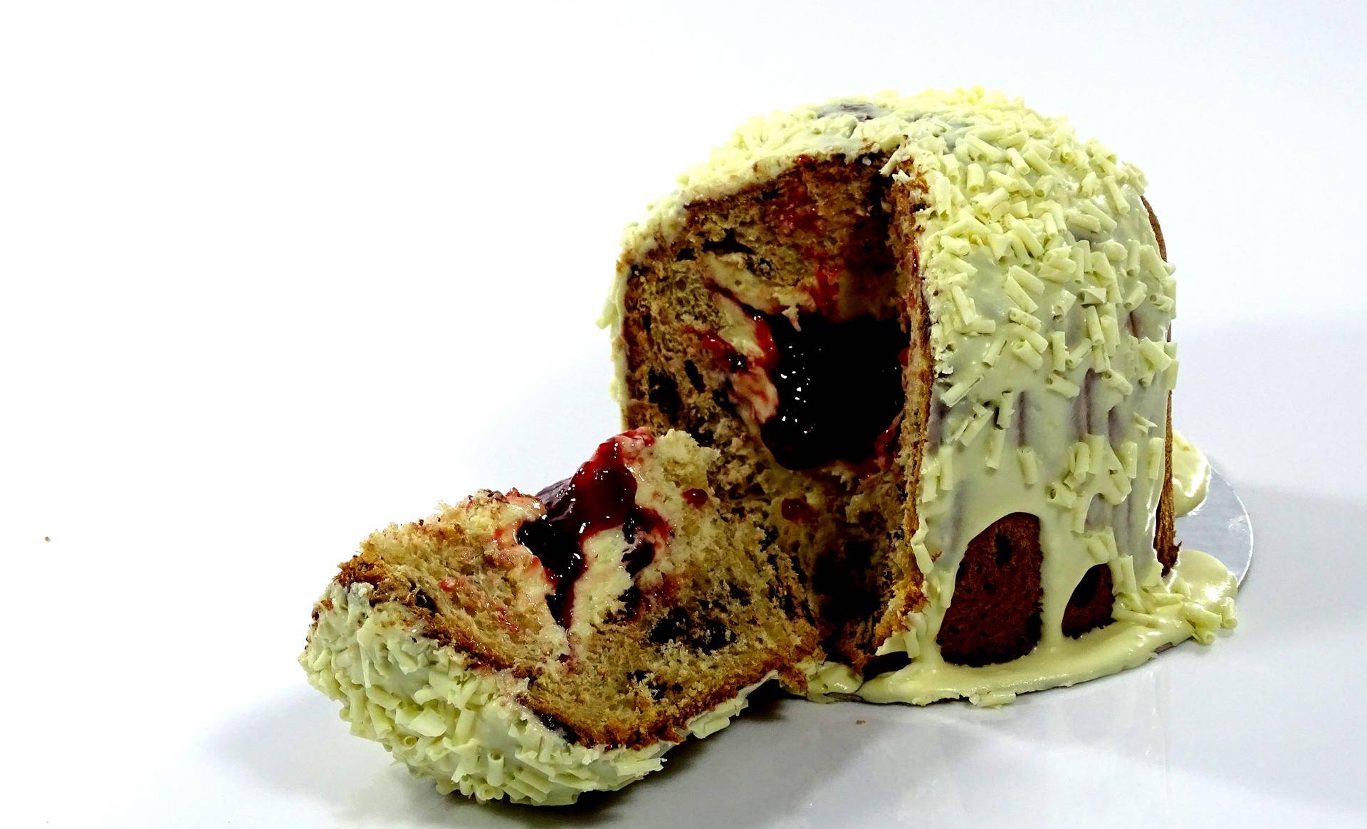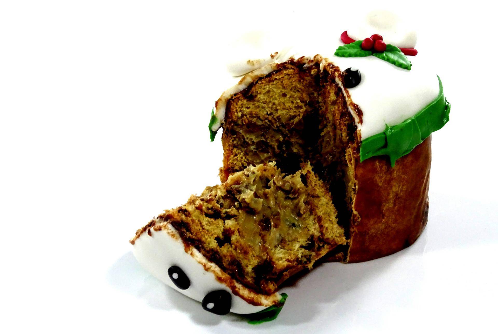 O chocotone que nós provamos era recheado com doce de leite (que foi mega elogiado) e a cobertura era uma escultura em pasta americana de um ursinho polar – que tem tudo a ver com Natal. Também há opções de escultura de boneco de neve e outros bichinhos ou cobertura tradicional, sem a pasta.