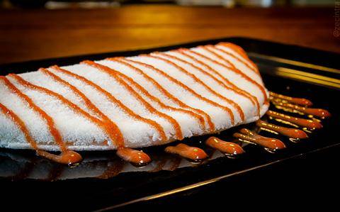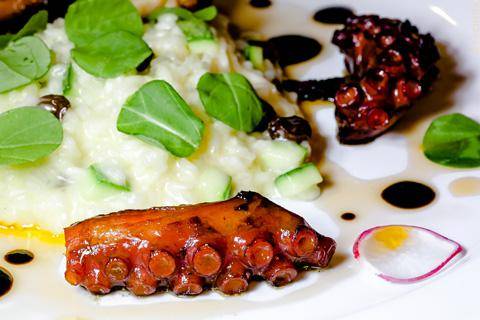 - Entrada: Tartine de omelete de salmão defumado, mini salada de folhas, pontas de aspargos e caviar de lúpulo ou Risoto negro com polvo e purê de molho campanha