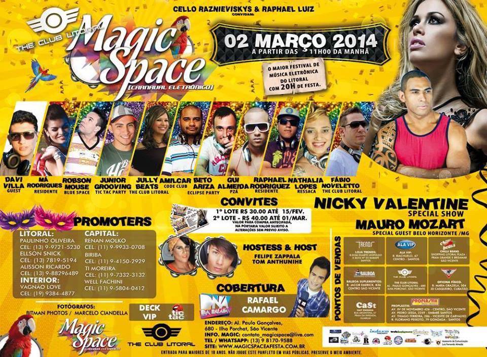 A Magic Space, a maior (e melhor) festa da Baixada Santista prepara mais uma edição de Carnaval que promete lacrar a Costa da Mata Atlântica (rysos) , com muitas atrações boas e 20 horas de musica eletrônica daquele jeito animado que vocês já conhecem e sabem como é bom com toda a estrutura e conforto da The Club Litoral.