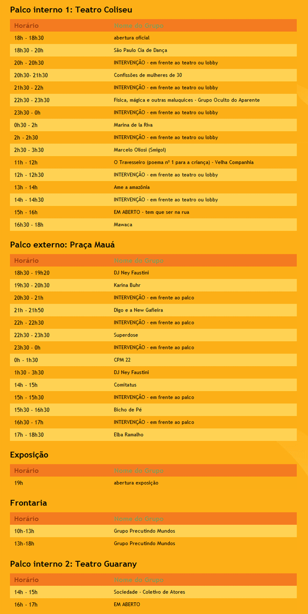 Confira abaixo a programação aqui de Santos. Como esse calendário tá bem adiantado, é bacana conferir sempre aqui se houve alguma mudança. Lembrando ainda que todas as atrações da Virada Cultural são gratuitas! \o/