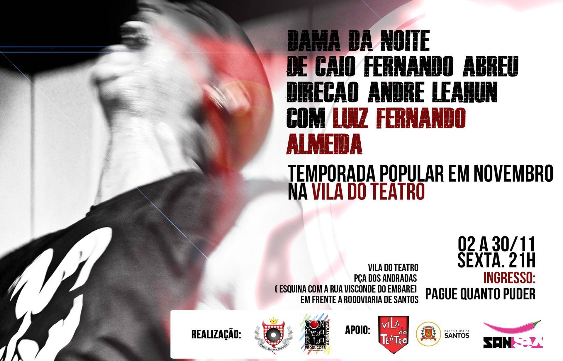 Na sexta-feira (30/11), acontece a última sessão da temporada do espetáculo “Dama da Noite”, monólogo com Luiz Fernando Almeida e direção de André Leahun, sempre às 21h com ingressos no sistema “pague quanto puder”. Ótima chance para assistir a uma das peças de maior sucesso do circuito santista nos últimos anos.