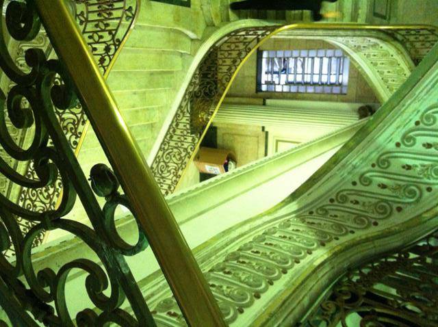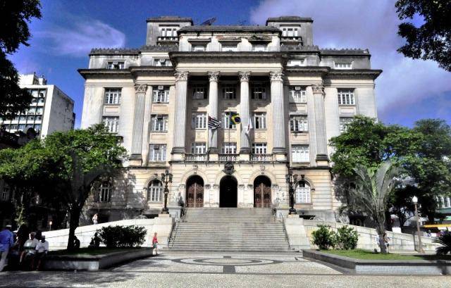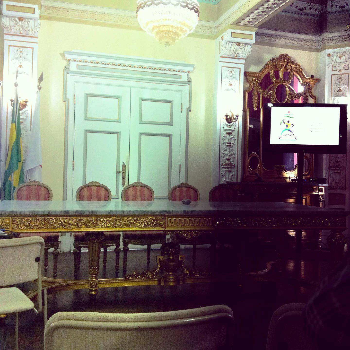 O salão nobre Esmeraldo Tarquínio é uma obra de arte. Idealizado nos moldes do Palácio de Versalhes, na França, tem lustres de cristal Bacarat que impressionam, piso de madeira nobre feito em marchetaria e detalhes dourados feitos com pós de ouro. Há também um ar condicionado enorme tentando passar desapercebido mas condizente com o clima “ameno” do verão santista.