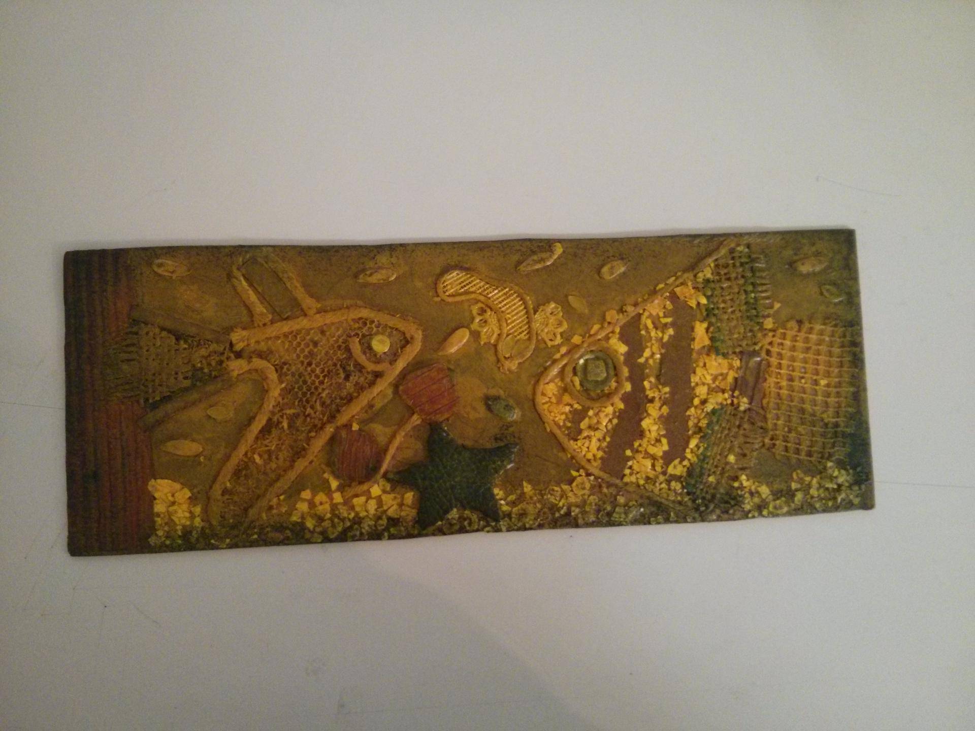 A técnica – que agrega materiais com textura ao suporte escolhido – é desenvolvida por Cláudia desde seu Trabalho de Conclusão de Curso, em 2008. “Utilizo diversos materiais recicláveis, casca de ovo, sementes e outros. Eles são prensados e utilizados como carimbo no papel” explicou.