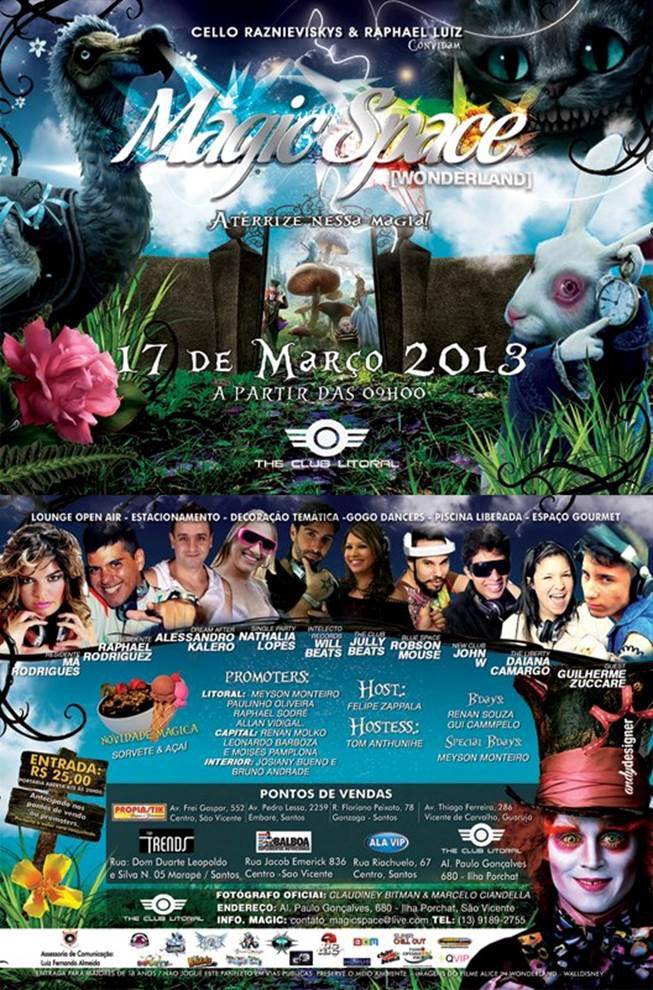 A festa Magic Space (Wonderland) chega a sua 7ª edição no dia 17 /03 , a partir das 9 horas na THE CLUB LITORAL , no Ilha Porchat em São Vicente. O tema escolhido para esta edição foi ” WONDERLAND” inspirado no filme Alice no país das maravilhas.