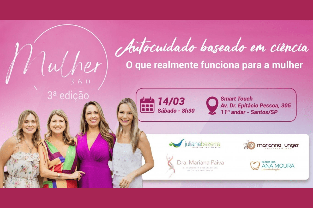 O evento Mulher 360º chega à terceira edição em Santos e propõe um talk show sobre saúde e cotidiano feminino. O encontro acontece no dia 14 de março, sábado, das 8h30 às 13h30, na Smart Touch, na Avenida Dr. Epitácio Pessoa, 305, 11º andar.