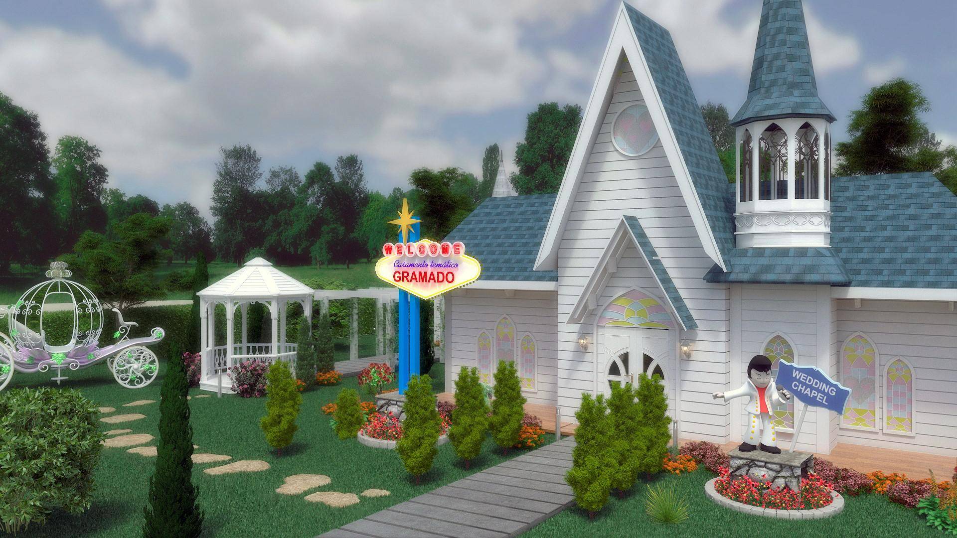 O espaço temático se chama Casamento dos Sonhos e tem 600 metros quadrados. Nesta área, fica um jardim lindo (ótimo para as fotos do casal), duas capelas tradicionais e um cenário com uma carruagem de 5 metros.