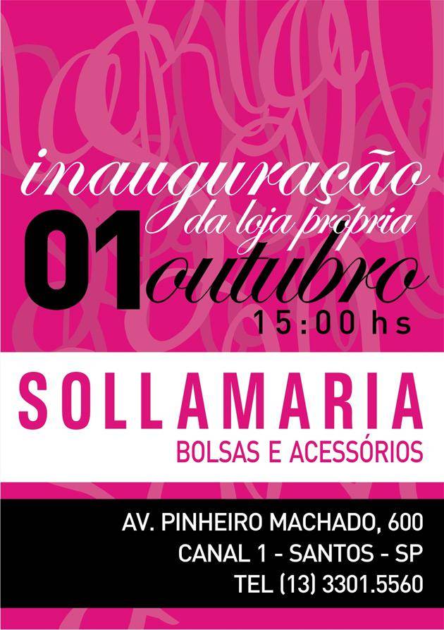 A loja ficará no Canal 1 (Av. Pinheiro Machado, 600). A marca Sollamaria ficou conhecida por produzir bolsas estruturadas em materiais como moleton, tecido e vinil. Tenho uma bolsa da marca e super recomendo!