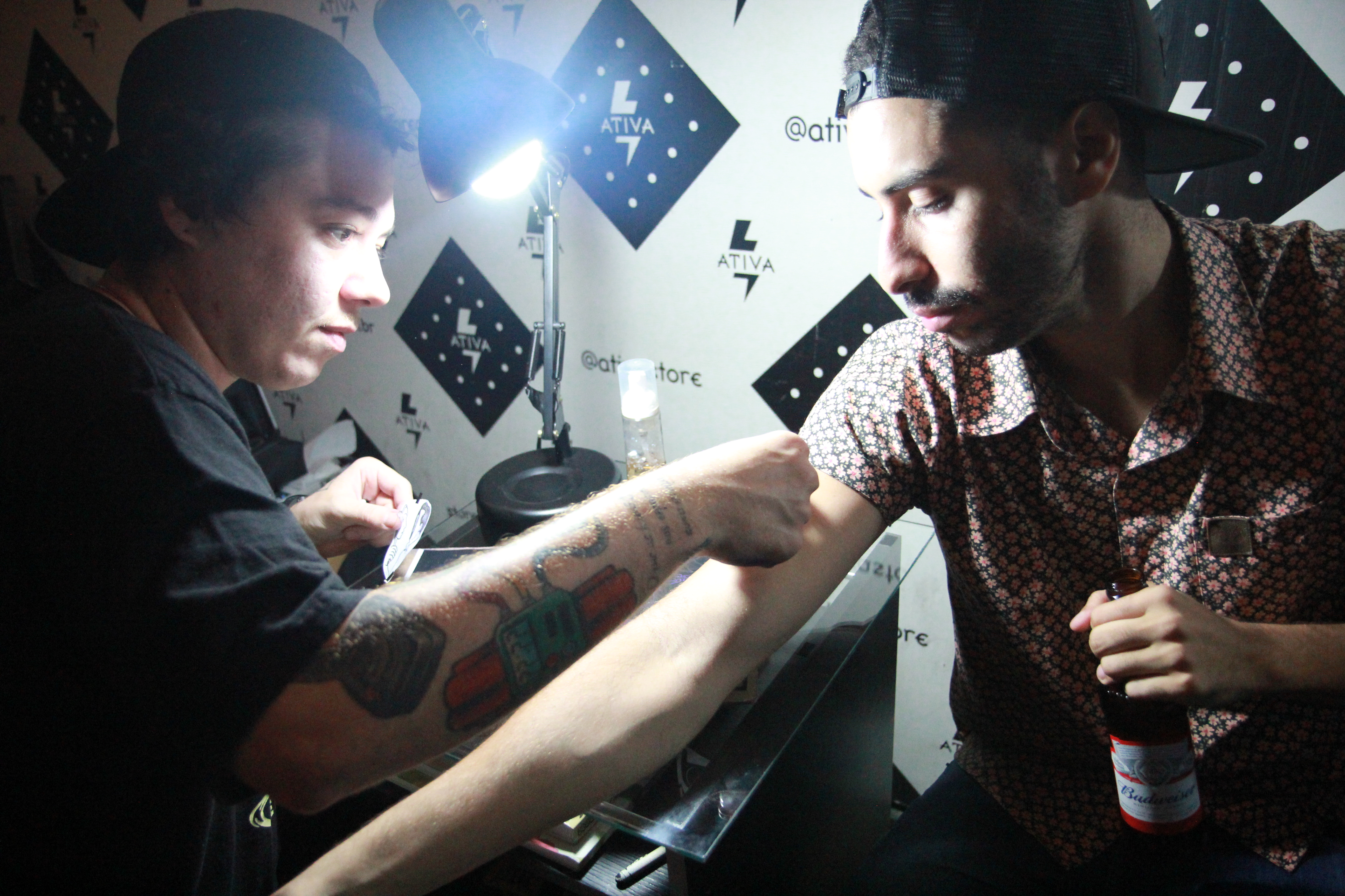 Quase todo mundo fez tatuagens na festa, mas que sairiam em no máximo dois ou três banhos depois por serem temporárias. Por outro lado, teve uma galera que topou sair rabiscada de verdade! Quem foi no evento se deparou com o tatuador Bento Araújo, que disponibilizou diversos desenhos para um flash day.