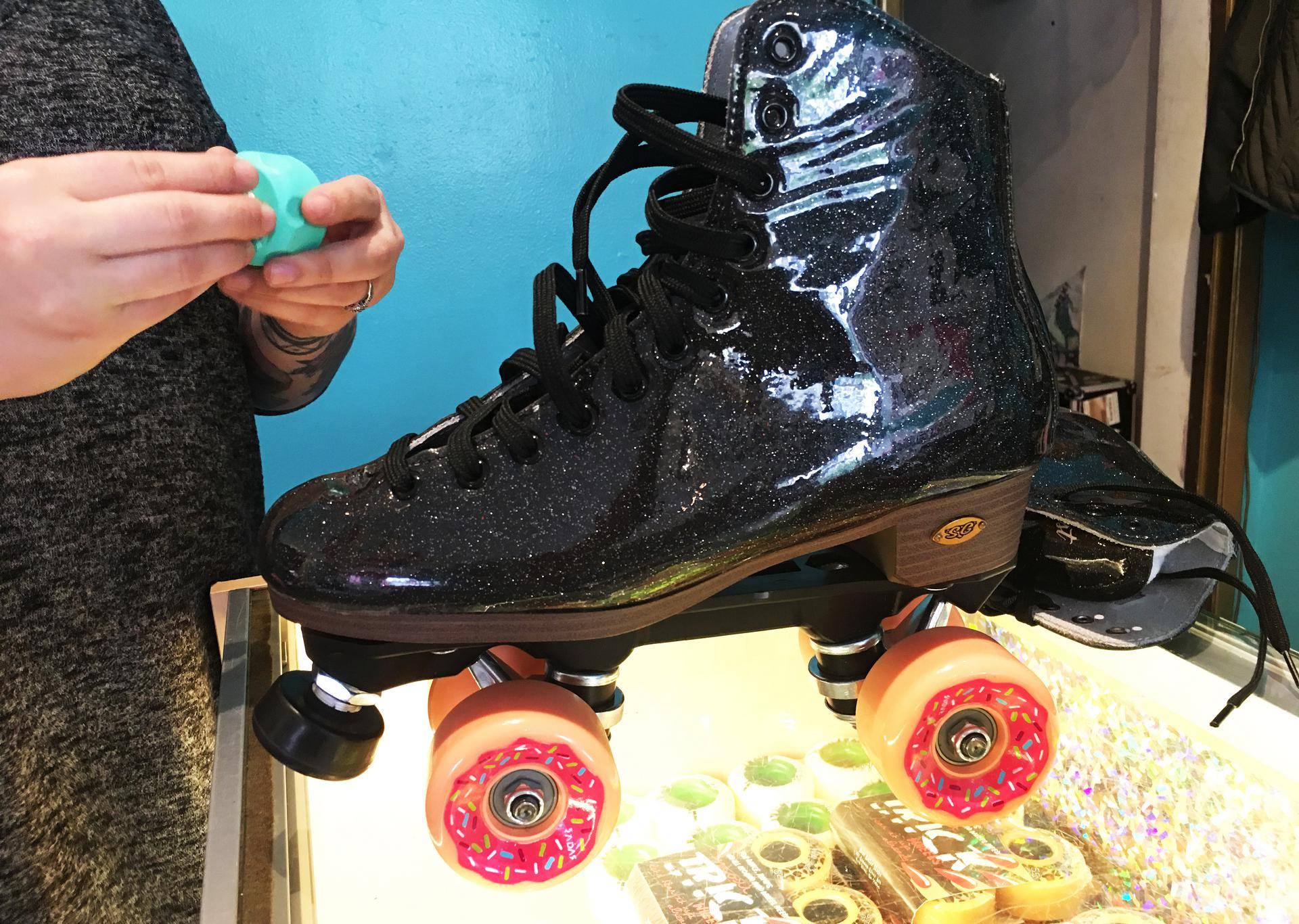 Essa foi a minha compra na Moxi: um patins Sure Grip Stardust que personalizei com o freio verdinho e a roda de donuts.