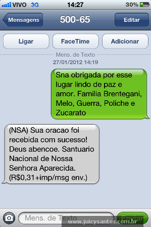 E pra quem pensa que a Basílica, ou melhor, o Santuário Nacional Nossa Senhora Aparecida (veja o site) disponibiliza aos fiéis ligados em tecnologia, pedidos de bençãos via SMS. Eu não podia deixar de pedir a minha: